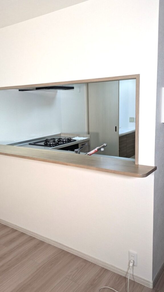 キッチンからリビングが見えるカウンターをもっと広くしたいということで、インタホーンの移動をし開口部を広げるご提案をしました。水回り4点+廊下~リビング・和室の床板張替え・全部屋のクロスの張替えをしました。